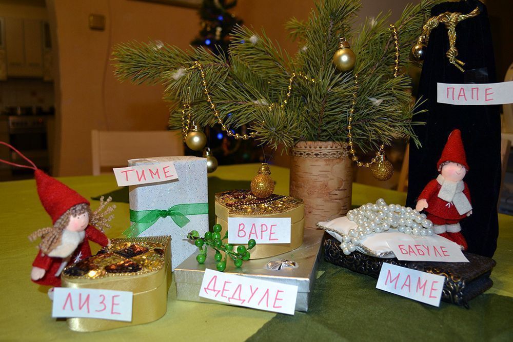 Пока мы ходим на улице, дома под елочкой «таинственным» образом появляются небольшие, но очень приятные подарочки. Дети возвращаются с мороза, быстро сбрасывают с себя верхнюю одежду и бегут наперегонки к елочке, а там на всех коробках подписаны имена. Смотрим, кому какой подарок достался.